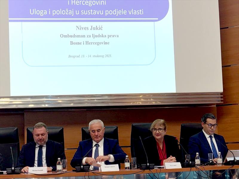 Ombudsman's Activities | 13.11.2025 Ombudsmeni Nives Jukić i dr. Nevenko Vranješ na obilježavanju 20. godina rada Ombudsmena Srbije Ombudsmen Nives Jukić and dr. Nevenko Vranješ at the celebration of the 20th anniversary of the work of the Ombudsman of Serbia Ombudsmeni Bosne i Hercegovine Nives Jukić i dr. Nevenko Vranješ učestvuju u radu naučne konferencije „Zaštitnik građana – Prvih 20 godina“, koja se održava u Beogradu 13. i 14. novembra 2025. godine u organizaciji Zaštitnika građana Republike Srbije, Univerziteta za kriminalistiku i policijske studije i Instituta za uporedno pravo. Na konferenciji organizovanoj u okviru obilježavanja ovog značajnog jubileja ombudsmenka Jukić će izlagati u okviru tematske cjeline „Pravna priroda institucije ombudsmana u sistemu podjele vlasti“, a ombudsman dr Vranješ u okviru tematske cjeline „Zaštitnik građana – pravni položaj i perspektive razvoja“. Učesnici konferencije su ombudsmeni iz regiona, predstavnici vlasti, međunarodnih i nevladinih organizacija, akademske zajednice, medija i dr. Useful Links Cooperation with NGO Agreements of the Ombudsperson Institution of BiH with other ombudsman institutions Freedom of Access to Information Marrakech Declaration, 12th October 2018 Operational Strategy of the Institution of Human rights Ombudsman of Bosnia and Herzegovina for the Period 2023 – 2028 Medium-Term Plan 2025-2027 Medium-Term Plan 2024-2026 Ombudsman Manual for handling discrimination cases Guidelines for filling in the complaints in the area of discrimination Application before European Court of Human Rights - Instruction The life of an application before the European Court of Human Rights News Archive We are protecting rights of natural persons and legal entities in accordance with the Constitution of BiH and international human rights instruments...Ombudsmen of BiH Ombudsman's ActivitiesOmbudsmeni Nives Jukić i dr. Nevenko Vranješ na obilježavanju 20. godina rada Ombudsmena SrbijeOmbudsmenka dr. Jasminka Džumhur učestvuje na konferenciji u okviru projekta „Jačanje zaštite ljudskih prava u aktivnostima poslovnog sektora BiH“Ombudsmen dr. Nevenko Vranješ na obilježavanju 20 godina niškog OmbudsmenaOmbudsmenka dr. Jasminka Džumhur u posjeti KPZ-u ZenicaOmbudsmenka Nives Jukić na konferenciji o izgradnji sistema koji će djecu trajno zaštititi od svih oblika nasiljaOmbudsmenke na Okruglom stolu o životu bez preprekaActivities Archive Latest publications Annual Report on results of the activities of the Institution of Human Rights Ombudsman of BiH for 2024P-83/25 - Recommendation regarding the treatment of the 31st child who was found unaccompanied by his parents in the Brcko District of Bosnia and HerzegovinaP-24/25 - Initiative to adopt the Law on Freedom of Access to Information of the Brčko District of Bosnia and HerzegovinaSpecial report regarding the prevention of the risk of statelessness in Bosnia and Herzegovina, November 2024